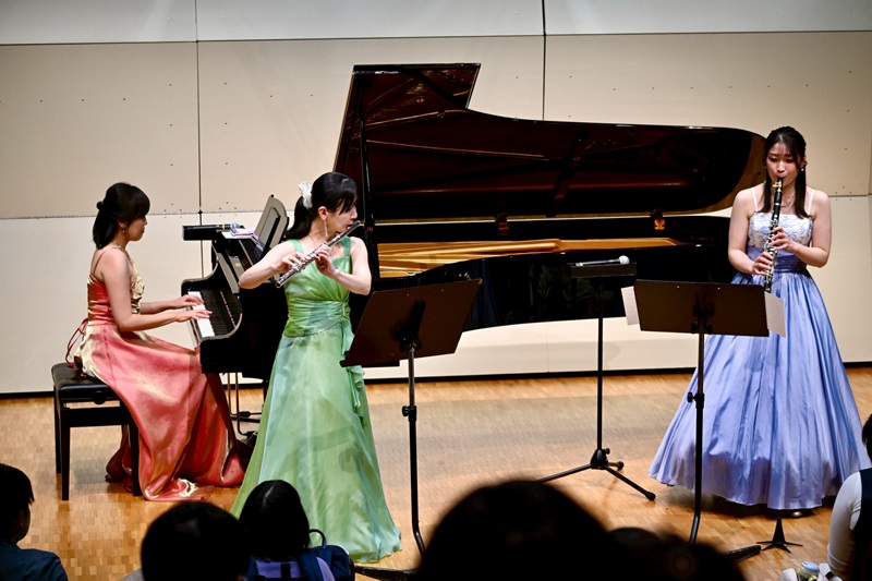 前半は池田緋沙子さん(フルート)・簗田ちゆりさん(クラリネット)・渡邉千晶さん(ピアノ)による手拍子が生まれるような楽しいコンサート、後半は出演者・参加者交えたフリートークが行われました。